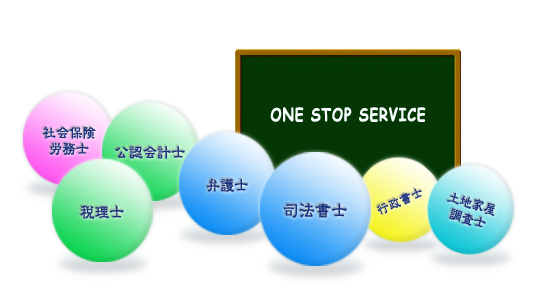 司法書士法人イトーリーガルは、公認会計士、税理士、弁護士、社会保険労務士、土地家屋調査士、行政書士と協力したワンストップサービスを実施していますので、税務・会計・法務・労務等についてのご相談を一つの窓口で受付しております。